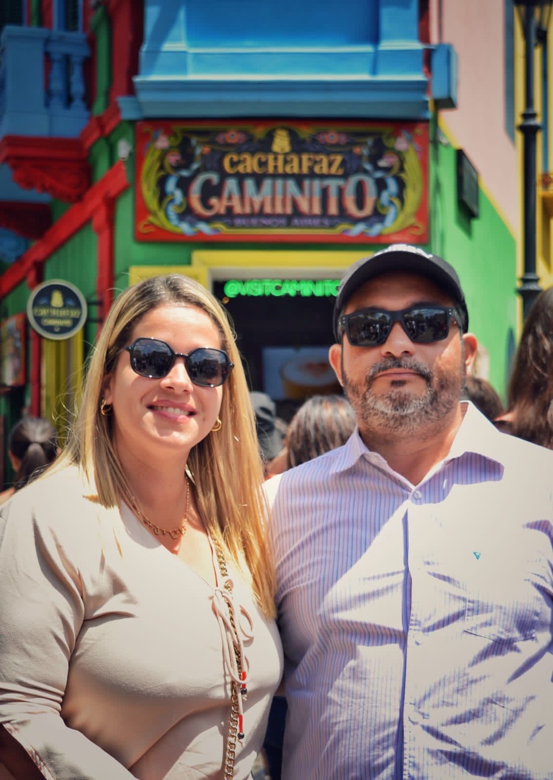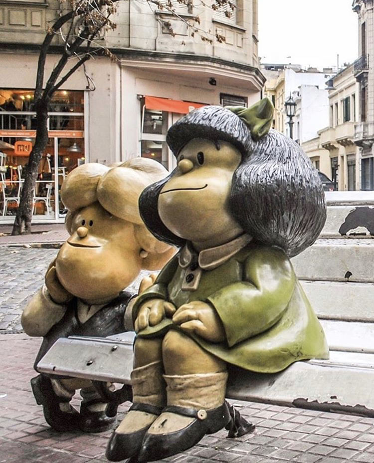 - Um garoto cumprimenta Mafalda em San Telmo. Um casal está de mãos dadas na frente do Generic Floralis. Uma câmera filma em frente às fachadas coloridas do Caminito.